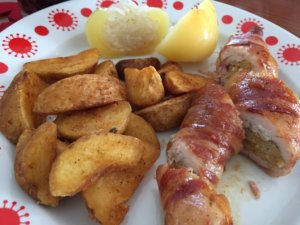Egyenként betekerjük a roládokat a bacon-be, tepsibe tesszük, fóliával lefedjük.