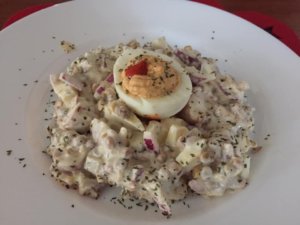 Hozzáadjuk a felaprított lilahagymát, a felkarikázott virslit és a főtt tojást kockákra vágva.