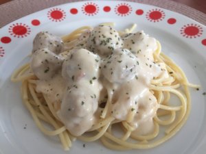 Amikor a sajt már felolvadt, belekeverjük a kisült húsgombócokat, spagettivel találjuk.