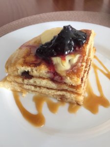 Juharsziruppal, különféle öntetekkel tálalhatjuk, adhatunk hozzá lekvárt, nutellát. Én most tetejére vajat tettem és áfonyalekvárral és karamell öntettel tálaltam. Adtam mellé még teljesen cukormentes áfonyalekvárt is, hogy hűek maradjunk a diétás étrendhez. ☺
