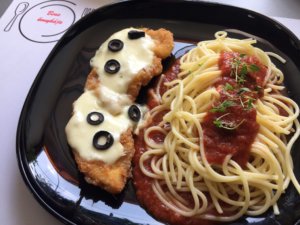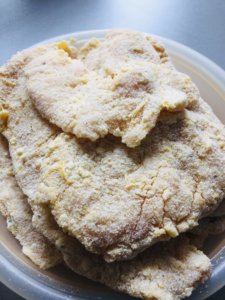 A panír hozzávalóit összekeverjük és a szokásos módon (liszt, tojás, fűszeres zsemlemorzsa) bepanírozzuk a húst.