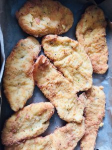 Forró olajban kisütjük a szeleteket, leitatjuk róla a felesleges zsiradékot és sütőpapíros tepsibe helyezzük egymás mellé a szeleteket.