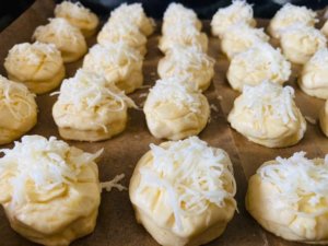 Közepes szaggatóval szaggatjuk, tojással lekenjük, sajttal megszórjuk, de anélkül is nagyon finom. Sütőpapíros tepsibe tesszük és 175 fokon aranybarnára sütjük, előmelegített sütőben. Jó étvágyat kívánunk hozzá! 🤗