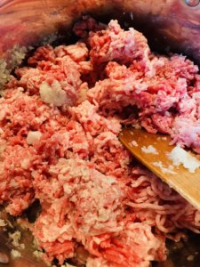 A zsírra feltesszük a lereszelt vöröshagymát dinsztelődni. Rátesszük a húsokat, majd addig pároljuk, amíg a hús ki nem fehéredik és levet ereszt.