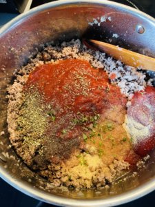 Ezután hozzáadjuk a paradicsomot és a ketchupot, majd fűszerezzük ízlés szerint. Hozzáöntjük a vizet, jól összeforraljuk és lefedve még egy darabig pihentetjük.