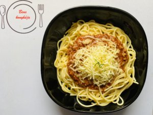 Spagettit főzünk hozzá és tetejét reszelt sajttal megszórva tálaljuk.
